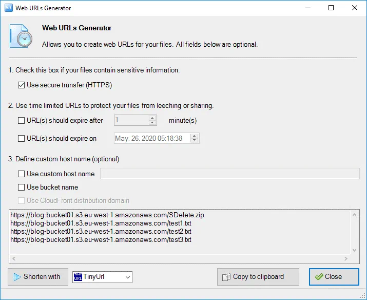 Generate Web URLs. The web URLs generator is used to generate URLs for CloudFront distributions. This feature is useful when you need to get a list of links to your files stored in a bucket in a few clicks. A generated list of links can be copied to clipboard.