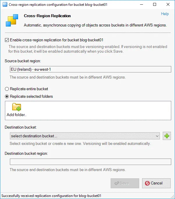 Amazon S3 Browser allows you to configure cross region replication. Select the bucket in the bucket browser located in the left side of the main window of S3 Browser. Then go to Buckets > Cross Region Replication. Select the checkbox: Enable cross-region replication for bucket your_bucket_name. The source bucket region is displayed automatically. Select one of the options: