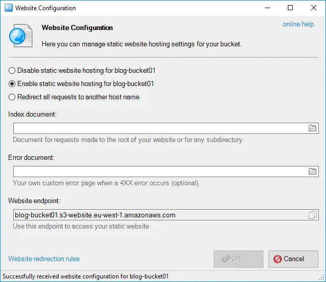 Edit Website Configuration. Use this option if you need to configure static website hosting settings for your bucket. You can set the index document and the page that must be loaded when an error occurs. A bucket name must meet DNS requirements. It is also possible to configure redirection rules for a static website.