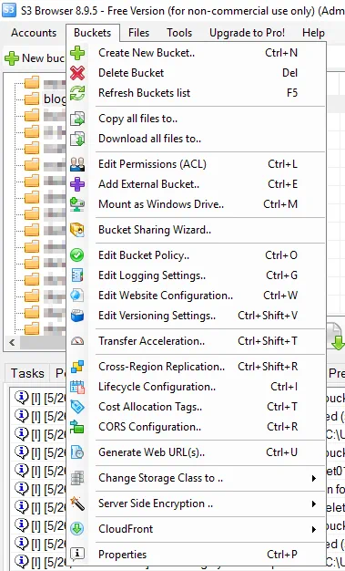 This menu contains a high number of options. As an alternative, you can right click a bucket name in the bucket browser section of S3 Browser to open the Buckets menu. Let’s list them and review the most interesting options. The purposes of the first options are obvious: