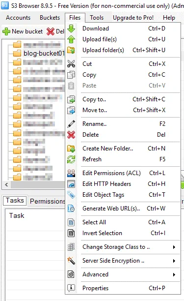 Most of the options in the Files menu are the same as the options of the Buckets menu. You can use these options after selecting files in a bucket. These options are then applied to the selected files (see the screenshot below). As an alternative, right click the file name in the file browser section of S3 Browser to open this menu.