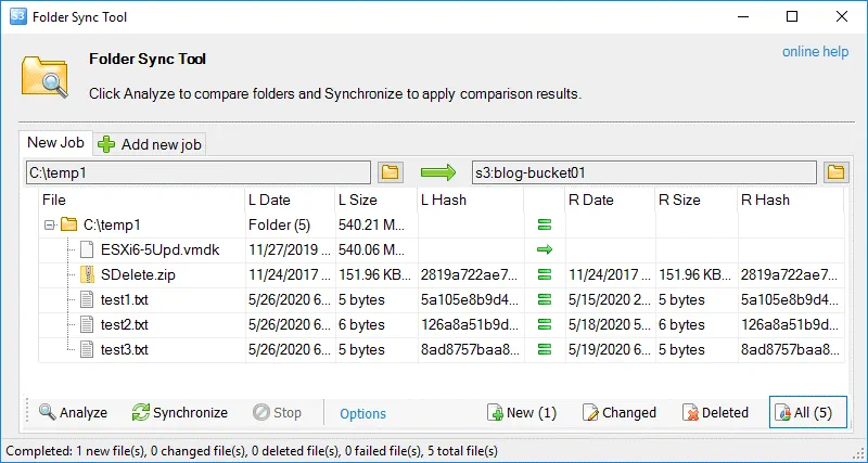Folder Sync Tool. This option helps you download or upload only new objects for rational bandwidth usage and time saving. This tool is useful when you back up files manually from a directory on your local disk drive to a directory in an Amazon S3 bucket. If a new file was created, this file will be transmitted when you synchronize folders. If a file was edited, this file will be transferred as a new file to the destination folder.