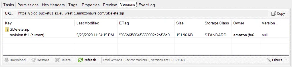 Versions. If versioning is enabled for your Amazon S3 objects, you can select the S3 object (a file stored in a bucket, for example), open the Versions tab and manage versions. It is possible to download, restore, and delete versions of Amazon S3 objects by using the graphical interface of S3 Browser. Versioning options can be set in Buckets > Edit Versioning Settings.