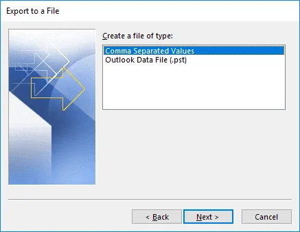 Select Export to a file. Click Next at each step of the wizard to continue.
