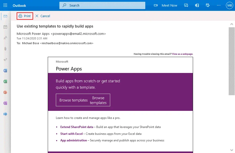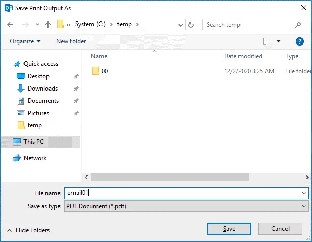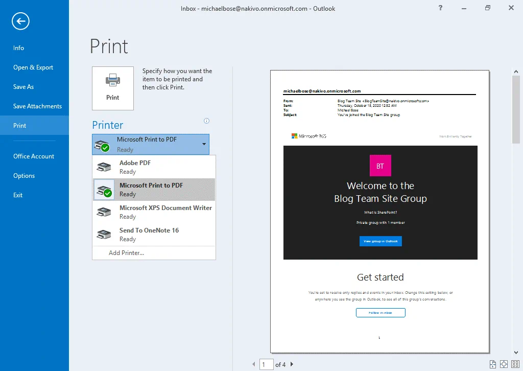 With this method, you can use a virtual PDF printer, which prints an email message to a PDF file, and, as a result, allows you to export email from Office 365 to the PDF file format. You can then save this PDF file on your desktop machine.