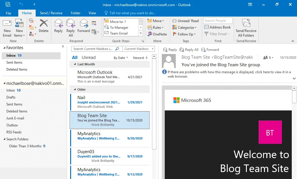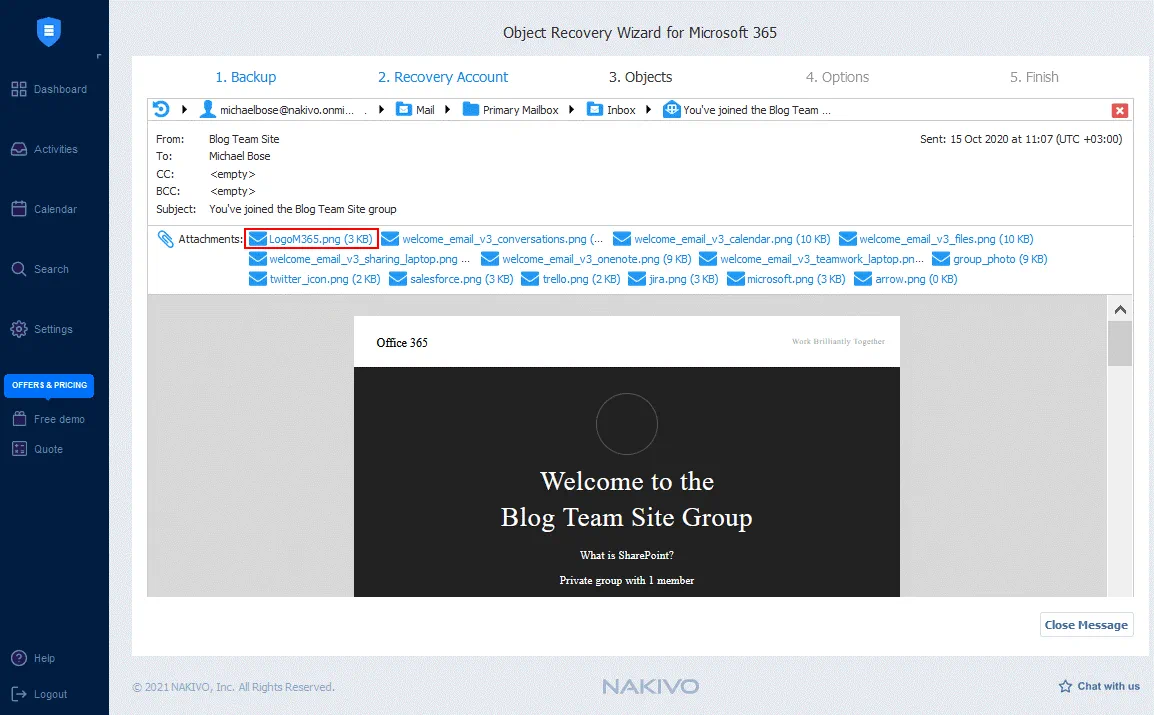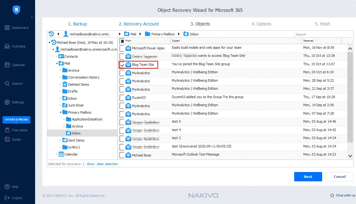 - Objects. Select objects for Microsoft 365 mailbox available for the selected backup job. Select the checkboxes for the needed emails, email folders, or all emails/attachments in the mailbox. You can also recover contacts and calendars. I select the message from Blog Team Site to Recover. Click the selected message to open the preview of this message.