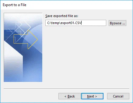Set the location for file export. Click Browse and select where to save the file. I save my exported file as C:\temp\export01.csv.