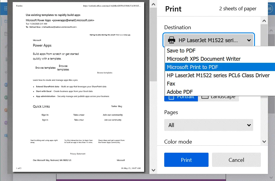 Then hit Print to send the selected Microsoft 365 email message to the virtual printer.