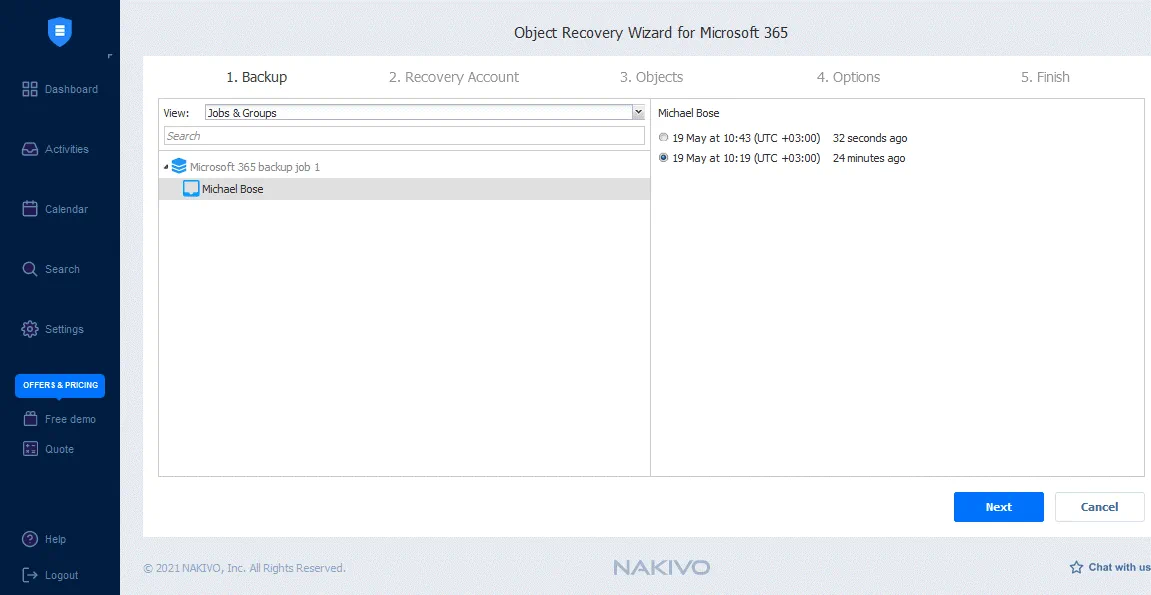 - Backup. Select the needed Microsoft 365 mailbox with the Microsoft 365 email messages that you want to recover. In my case, a backup job was created to back up emails of the “Michael Bose” mailbox, and I’m going to select this mailbox to recover. Then select the needed recovery point in the right pane of the interface. Hit Next at each step of the recovery wizard to continue.