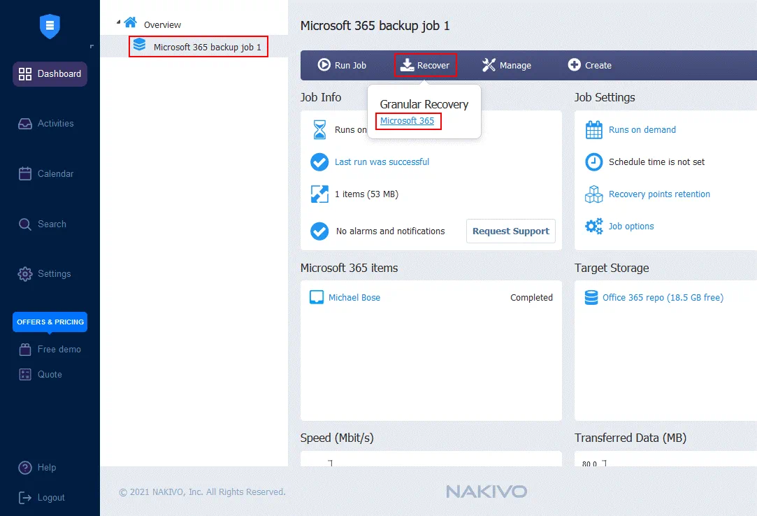 You can make your life easier by using a dedicated Microsoft 365 email backup solution that allows you to back up emails for the needed accounts, recover mailbox folders or emails to a source location or a custom location. NAKIVO Backup & Replication is a data protection solution that combines all these features and contains many additional features to protect Microsoft 365 email data and other Office 365 data. You can back up emails to a local backup repository on-premises, create multiple recovery points, and perform instant recovery of email messages, attachments, folders, contacts, and calendar items. You can schedule backup jobs (to run automatically) or you can run them on demand (manually).