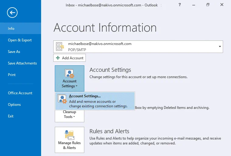 Click File, and on the Account Information page, select the needed Microsoft 365 email account in the drop-down list. Then click Account Settings, and click Account Settings once again.