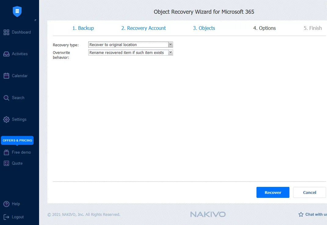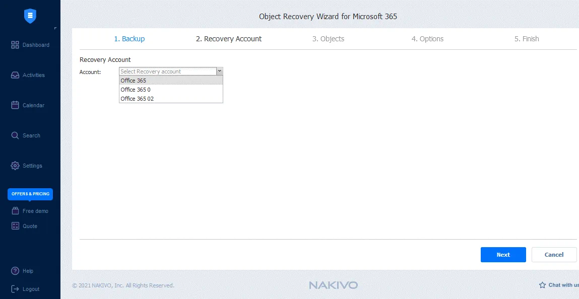 - Recovery Account. Select a Microsoft 365 account to which you want to recover the Microsoft 365 email data. In my example, I’m going to select my Office 365 account for data recovery.