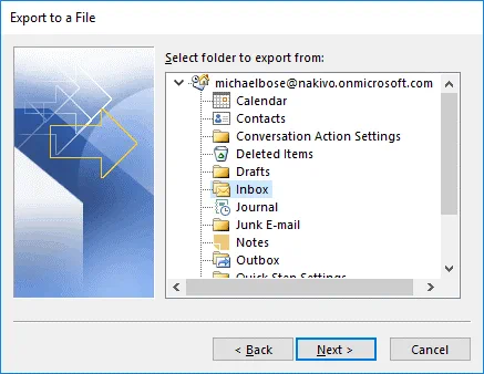 Select a folder to export from. I select the Inbox folder because I need to export emails from Office 365 that are received by my user.