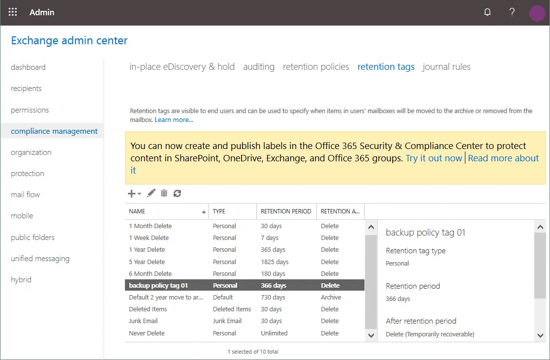 Let’s find out how to set up Office 365 backup policies using as an example the retention policies in Exchange Online.