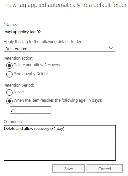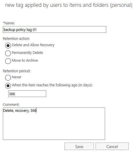 Let’s select Delete and Allow Recovery as a retention action and set the retention period to 366 days. You can set Never if you want to set the maximum retention period. Write a comment if needed (this is an additional option). Hit Save.