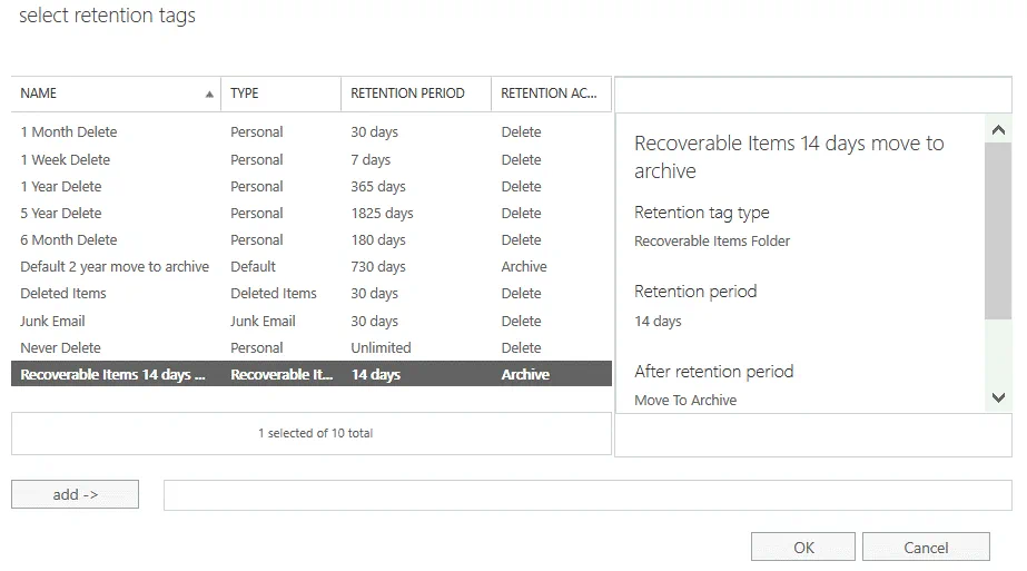 Select the needed tag for setting up your Office 365 backup policies. Let’s select Recoverable items 14 days move to archive for backup policy 01 in our example. You can select multiple tags (policies allow you to group retention tags and apply them to users). After selecting the needed tag, click Add. When all needed tags are selected, hit OK to save settings.