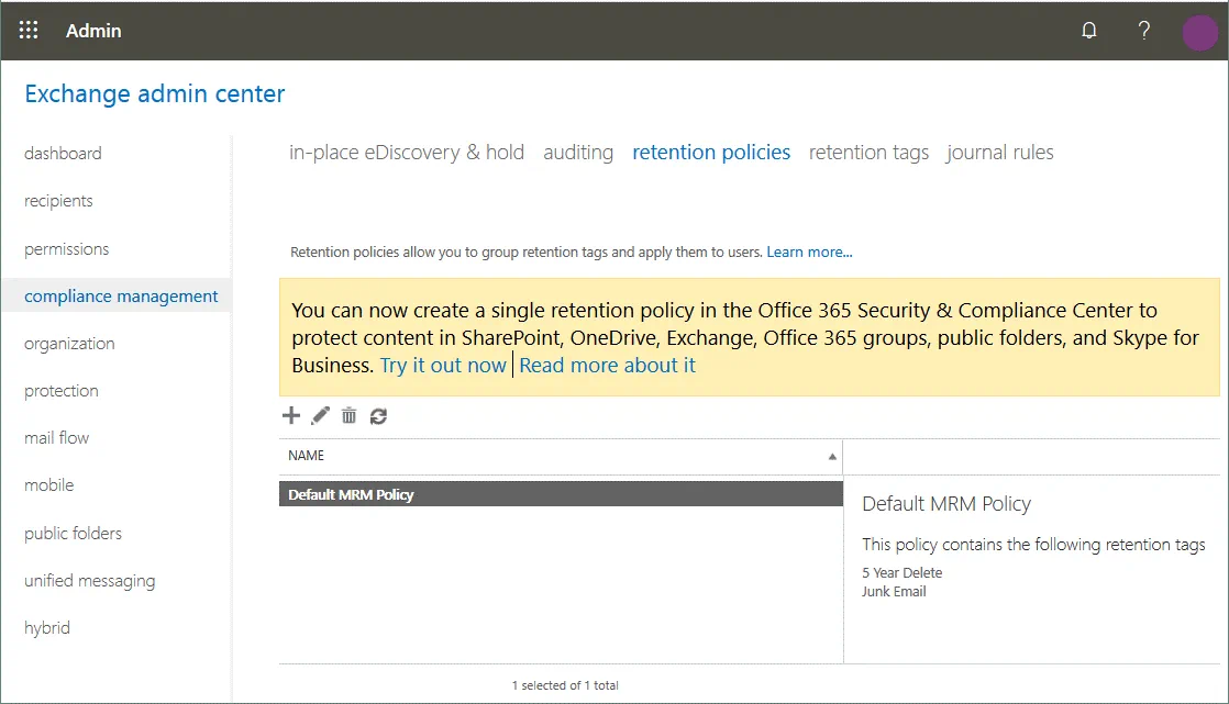 In the left pane (navigation pane), select compliance management and go to the retention policies tab.