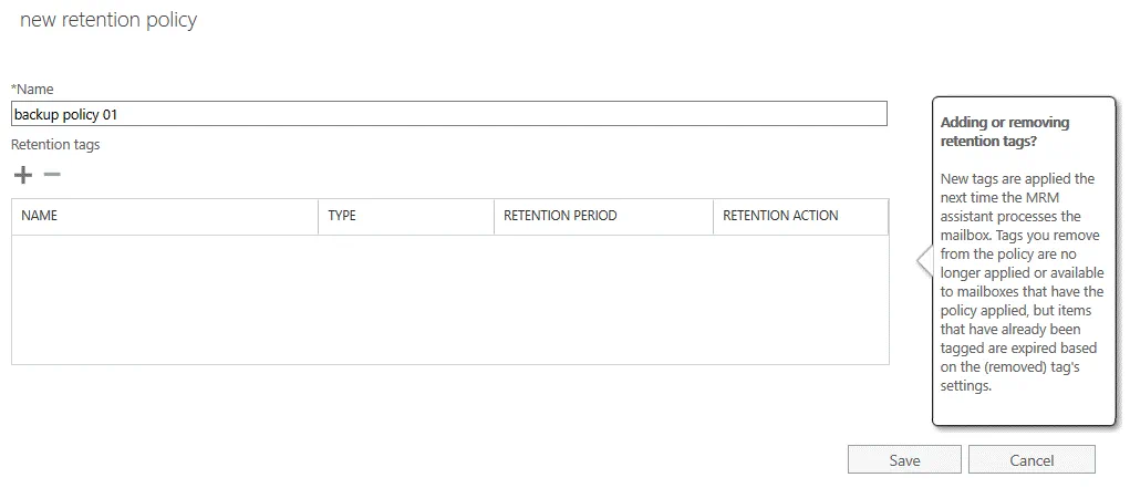 On this page you can create retention policies that are applied to user accounts. A policy that is applied to user accounts by default is called an MRM policy in Office 365. Once a new user account in Office 365 is created and a license is assigned to that account, the MRM policy is applied to the account. Click the + icon to create a new policy.