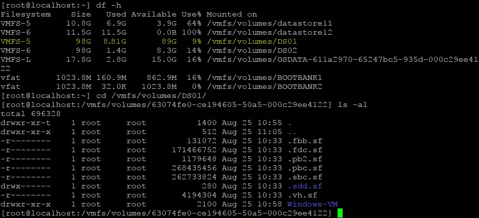 command to see used and free disk space on datastores. You can go to the datastore and see stored folders and files: cd /vmfs/volumes/DS01/ (where DS01 is the datastore name). The ID of the selected datastore will be placed in the selected path automatically instead of the datastore name (63074fe0-ce194605-50a5-000c29ee4122 in our case). Use the ls -al command to list the contents of the directory. - The command line interface allows you to copy VM files, including virtual disks, other files, and directories.