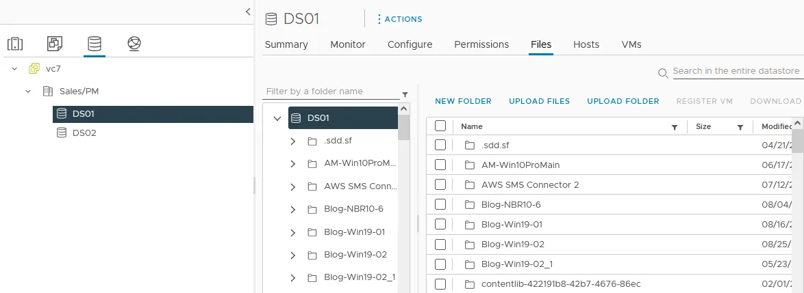 - Check free disk space on the second datastore, which must be a VMFS 6 datastore (DS02 in our case). Make sure that there is enough free space to migrate VMs from the first datastore. You can check the free space in the GUI of VMware vSphere Client by going to Inventory > Datastores, selecting the needed datastore and viewing information in the Summary tab (see the right side of the screenshot above).To check the files stored in the datastore, open the Files tab.