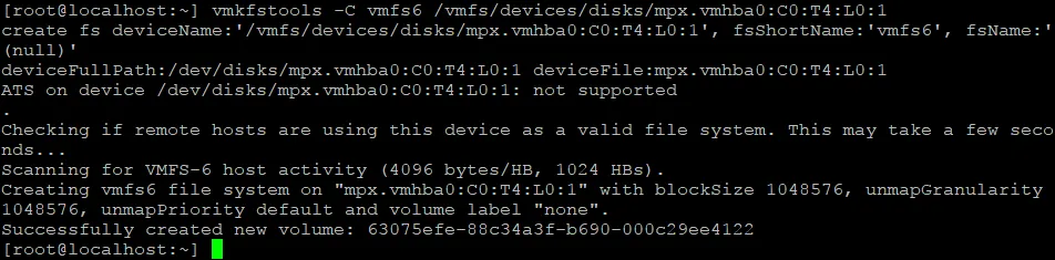 command. In our case the command is:vmkfstools -C vmfs6 /vmfs/devices/disks/mpx.vmhba0:C0:T4:L0:1
