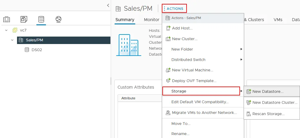 - Create a new VMFS 6 datastore on the same LUN/partition where your VMFS 5 datastore was located (DS01 in our example). Select your data center and click Actions > Storage > New Datastore.
