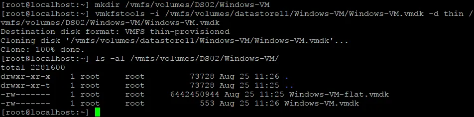 vmkfstools -i /vmfs/volumes/datastore11/Windows-VM/Windows-VM.vmdk -d thin /vmfs/volumes/DS02/Windows-VM/Windows-VM.vmdk