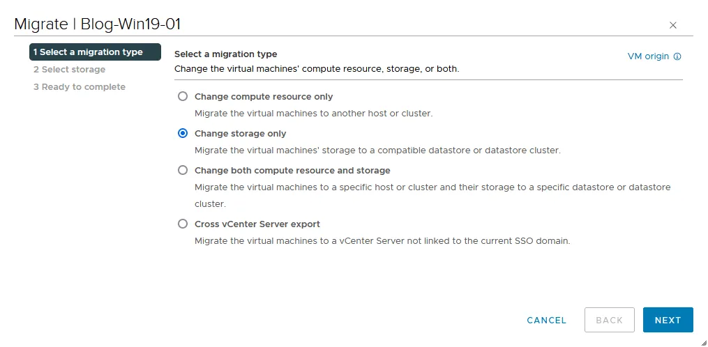 - Select storage. Select the VMFS datastore to which you will migrate the VM(s).