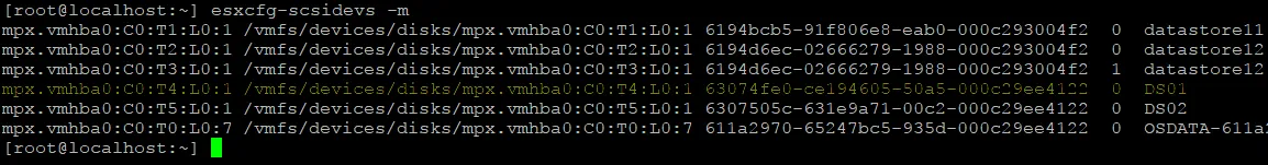 We note the disk device identifier mpx.vmhba0:C0:T4:L0:1 and the datastore UUID that is 63074fe0-ce194605-50a5-000c29ee4122.