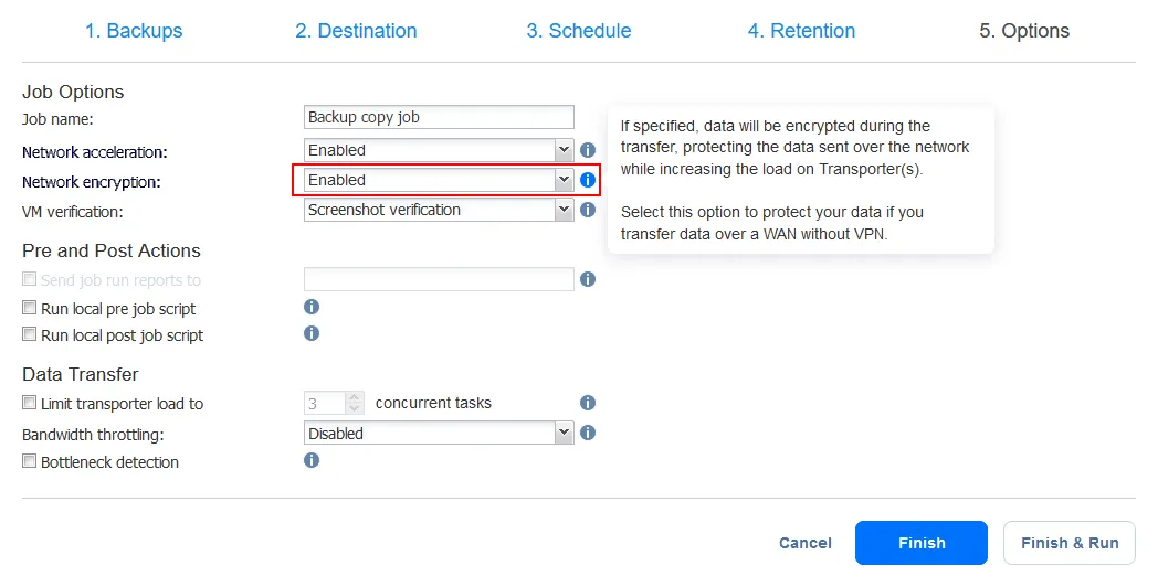 The second part of securing backups is encrypting data in flight. In a sample Backup Copy Job below in the NAKIVO backup solution, we can see that we have the option to select Enabled for Encryption in the job options. As the tooltip notes, job data will be encrypted during the transfer, which protects the data as it is sent over the network.