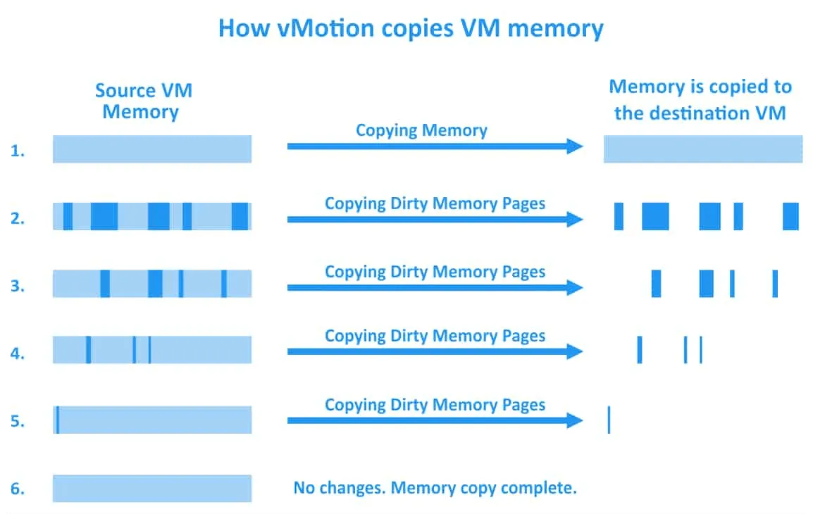 3. The next pass of copying memory pages from the source to the destination is performed, because memory pages are being changed during the VM operation. This is an iterative process that is performed until no changed memory pages remain. The changed memory pages are called dirty pages. It takes more time for VM migration with vMotion if memory-intensive operations are performed on a VM because more memory pages are changed.