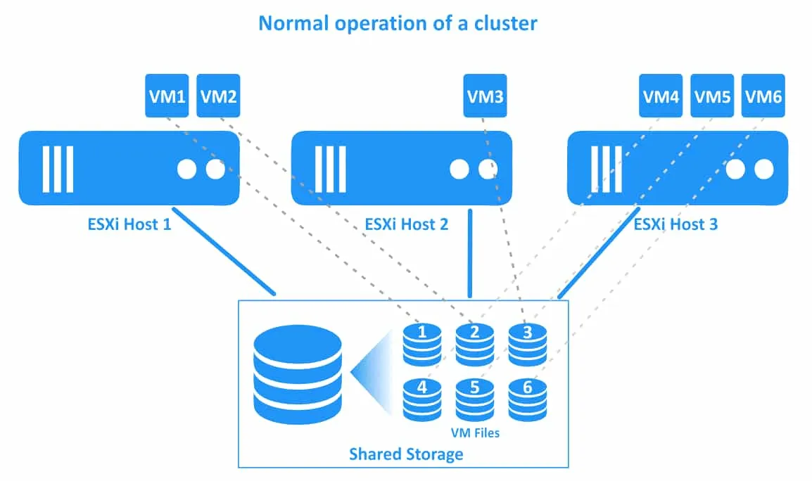 The workflow of a vSphere HA cluster is illustrated in the diagram below. There is a cluster with three ESXi hosts in this example. VMs are running on all hosts. The connections of the VMs and their files are illustrated with dotted lines.