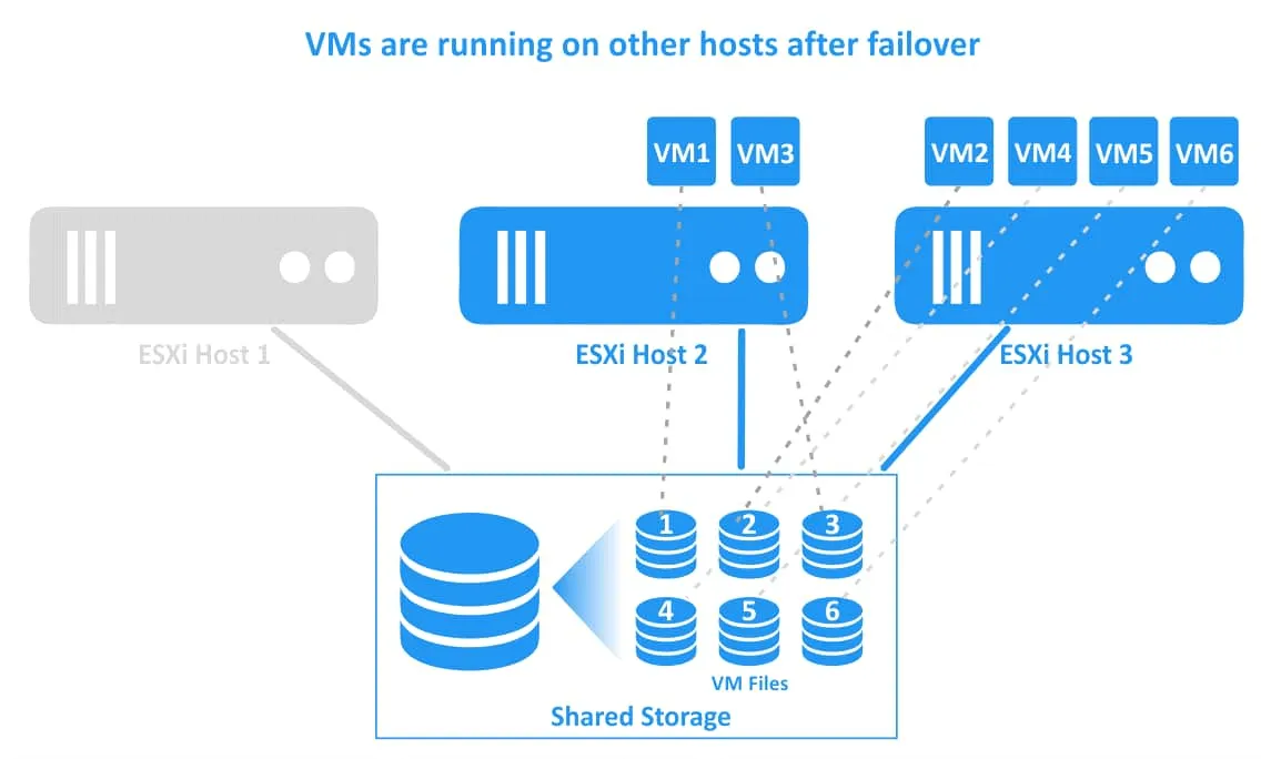 VMware vSphere High Availability checks ESXi hosts to detect a host failure. If a host failure is detected (VMs running on that host are also failed), then the failed VMs are migrated to healthy ESXi hosts within the cluster. After migration, the VMs are registered on the new hosts, and then these VMs are started. VM files (VMX, VMDK, and other files) are located on the same resource, which is a shared datastore, after migration. VM files are not migrated. Only the CPU, memory, and network components utilized by the failed VMs are provided by the new ESXi host after migration.