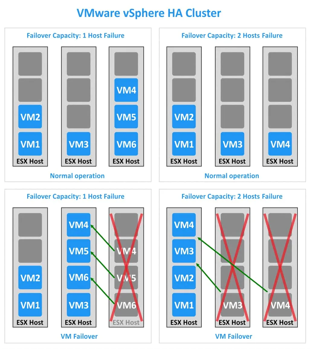 Let’s look at two cases, each with three ESXi hosts but with different failover capacity values. In the first case, the HA cluster can work after the failure of one ESXi host (see the left side of the image below). In the second case, the HA cluster can tolerate the failure of two ESXi hosts (see the right side of the image).