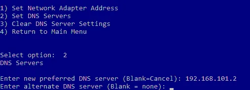 After configuring the network settings, you should test network connectivity. You can use option 15, Exit to Command Line. This takes you to the cmd prompt, where you can ping your gateway, DNS server, etc.