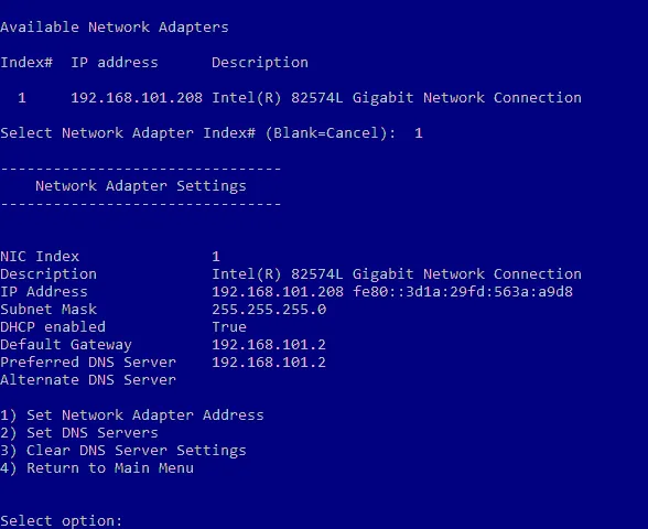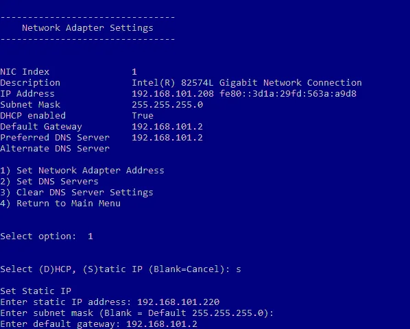 Network settings and most other settings in Windows Server 2016 Core are configured in the console interface: