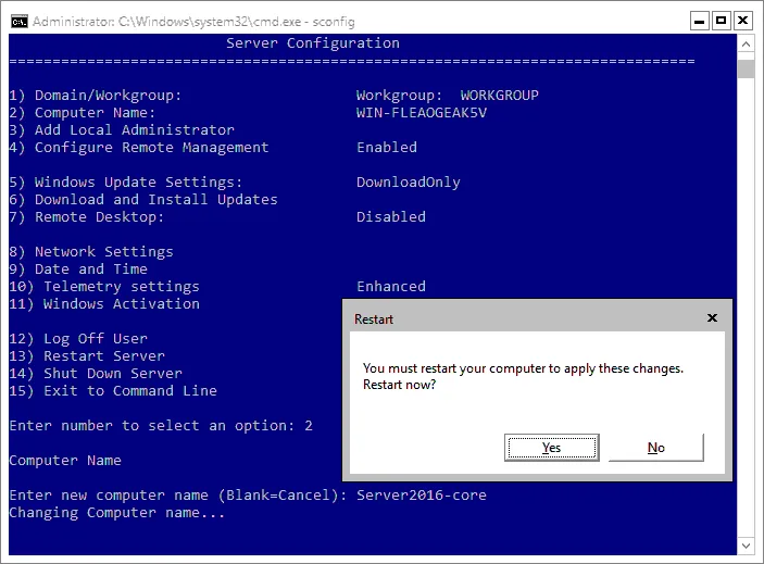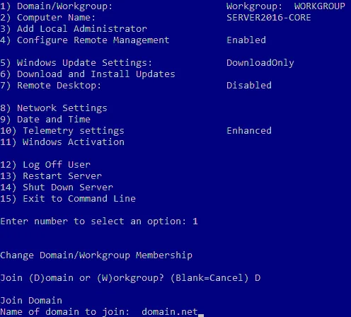 Now let’s run the sconfig command in cmd to open the Server Configuration menu again. You should join a Windows domain and change the computer name. Using an Active Directory domain with a domain controller allows you to manage all Windows machines centrally.