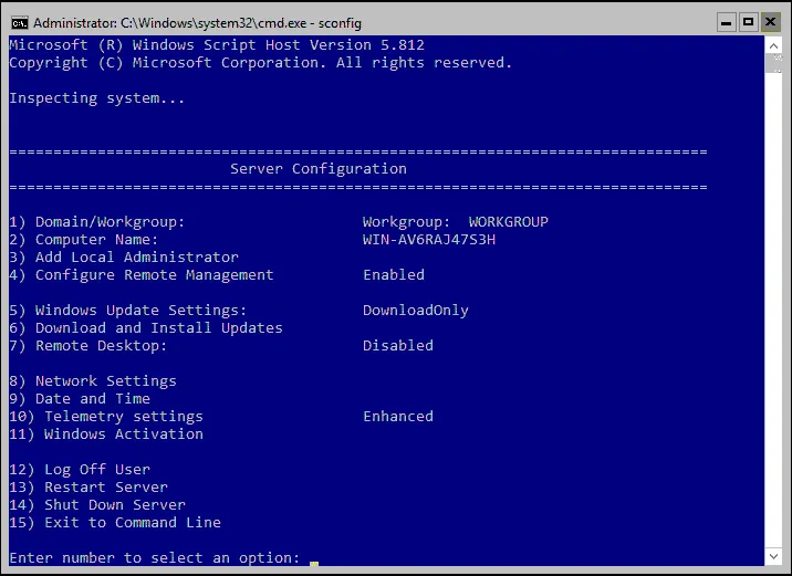 - Type sconfig in the command prompt to launch the Server Core configuration utility.