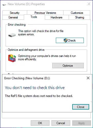 ReFS uses checksums that allow it to detect any data corruption and recover from that corruption quickly. In fact, if you look at a ReFS formatted volume and run Tools > Check on the volume, you receive the message: You don’t need to check this drive. The ReFS file system does not need to be checked.
