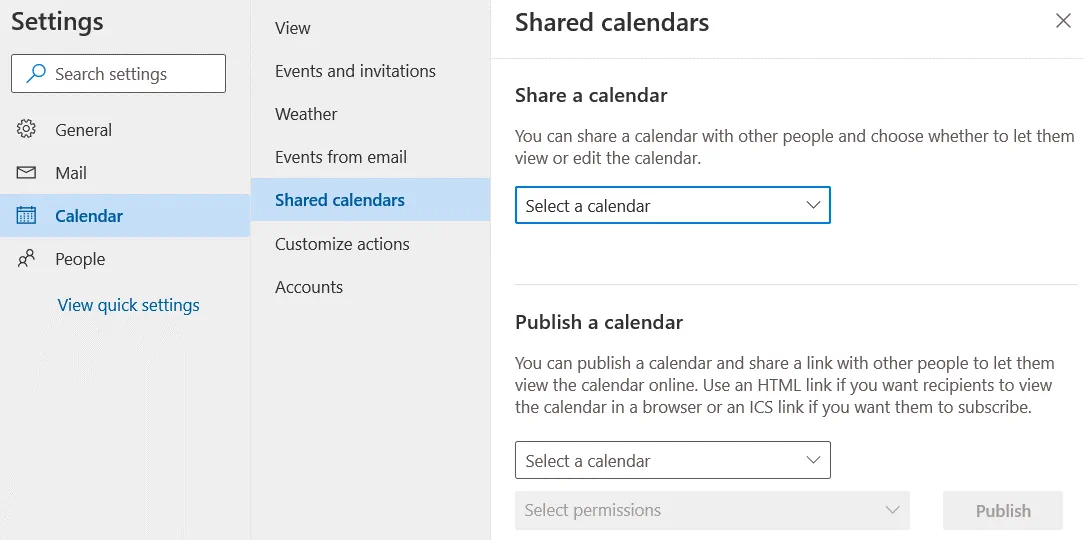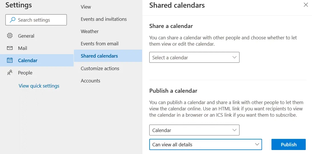 Para publicar un calendario en la sección Publicar un calendario de las opciones Calendarios compartidos, seleccione un calendario en el menú desplegable, seleccione los permisos para el calendario publicado en el segundo menú desplegable (por ejemplo, Puede ver todos los detalles) y haga clic en Publicar.