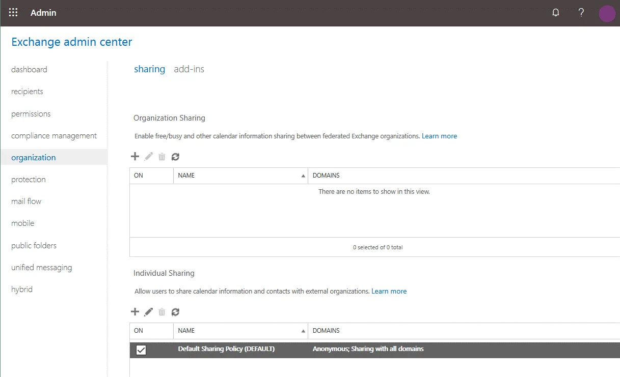 En los ajustes de uso compartido de una organización en el centro de administración de Exchange, puede configurar las políticas de uso compartido de la organización y las políticas de uso compartido individuales.