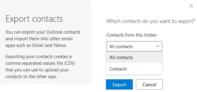En la ventana Exportar contactos, selecciona Todos los contactos y haz clic en Exportar. Los contactos se exportan a un archivo CSV (valores separados por comas) que puede visualizarse en Excel e importarse a clientes de correo electrónico o servicios web de correo electrónico.