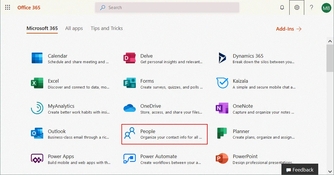 Una vez que haya iniciado sesión en Office 365 mediante la interfaz web, vaya a la página con las aplicaciones de Microsoft Office 365. Haga clic en el icono Personas para abrir una página web con los contactos de Office 365 de su cuenta.