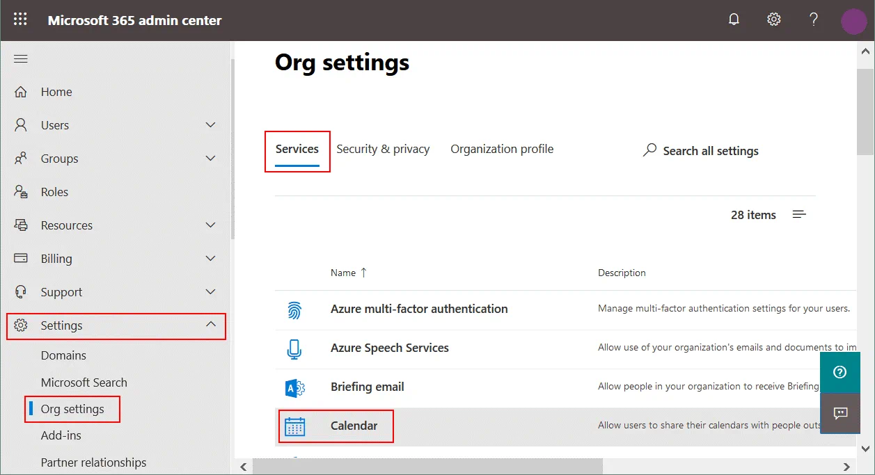 En el panel de navegación, haga clic en Ajustes > Ajustes de organización. A continuación, pulsa Servicios en la página de ajustes de Org y haz clic en Calendar.