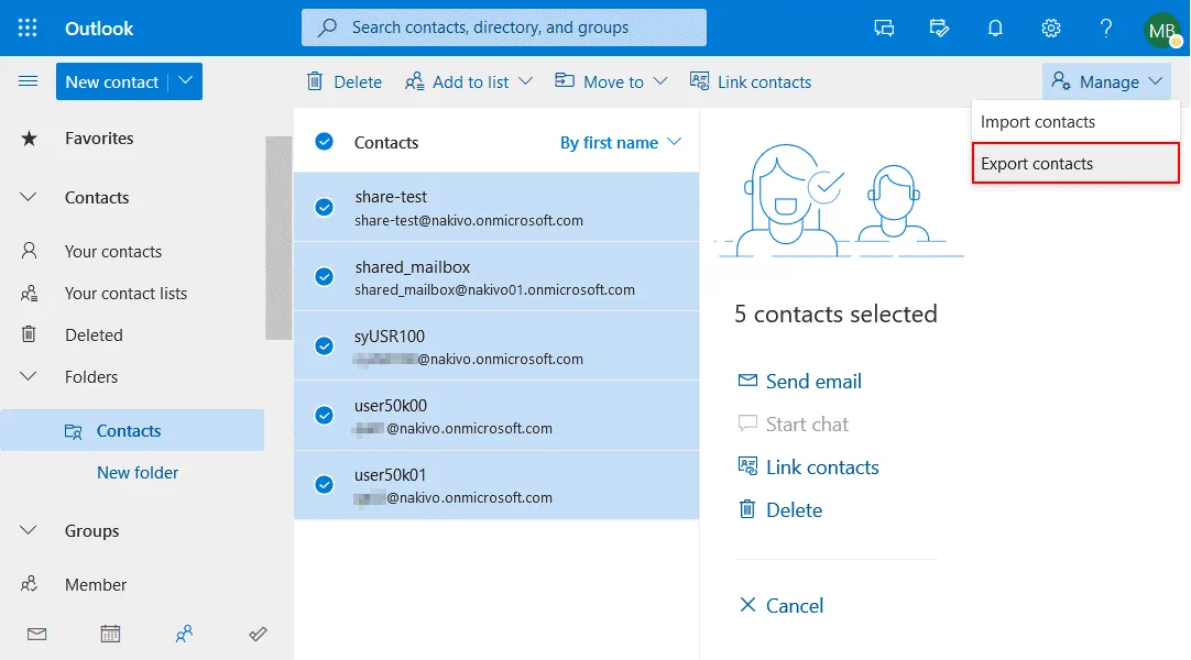 Se abrirá una página con tus contactos de Office 365 Outlook. Selecciona tus contactos y en la esquina superior derecha haz clic en Gestionar > Exportar contactos.