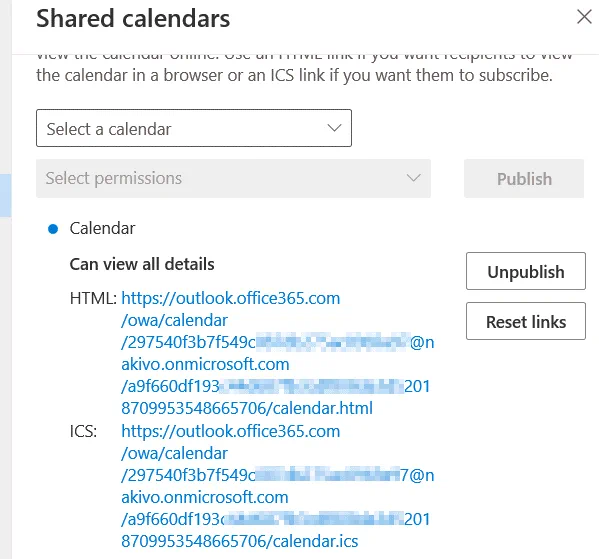 Espere unos segundos hasta que se publique el calendario. Una vez completada la operación, podrá ver los enlaces (URL públicas) para acceder al calendario publicado para usuarios externos. Ahora los usuarios pueden ver el calendario o suscribirse a él. Un calendario publicado puede ser visto por cualquier usuario que tenga un enlace al calendario.