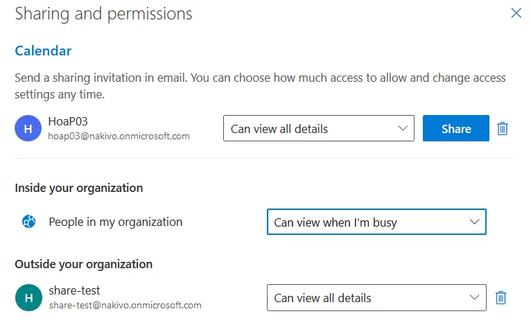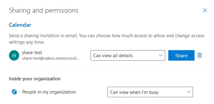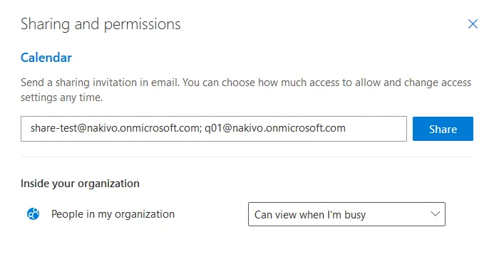 En la ventana emergente, configura las opciones de uso compartido y permisos. Tienes que controlar cómo los demás pueden utilizar el calendario compartido. Selecciona una dirección de correo electrónico de un usuario o grupo con el que quieras compartir tu calendario. Haz clic en el botón Compartir. En el menú desplegable, seleccione las opciones para los usuarios de su organización. Las opciones de permisos disponibles son: