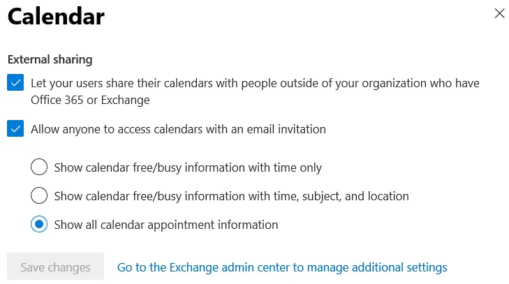 Permita que los usuarios de Office 365 de su organización compartan sus calendarios con personas ajenas a su organización. Permite que cualquiera acceda a los calendarios con una invitación por correo electrónico. Seleccione las casillas correspondientes como se muestra en la siguiente captura de pantalla. Pulsa Guardar cambios.