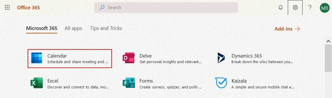 Seleccione Calendar en la lista de aplicaciones de Office 365.