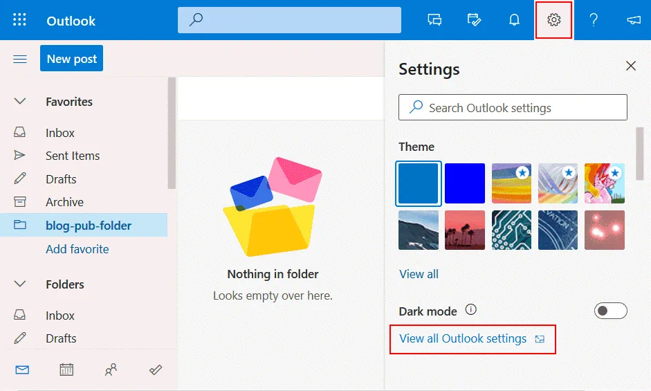 Los pasos de configuración que se indican a continuación pueden ser realizados por un usuario normal. Puede configurar el uso compartido y la publicación de calendarios de Office 365 abriendo Office 365 outlook Online mediante su cuenta de usuario de Office 365. Haga clic en el icono de ajustes situado en la esquina superior derecha de la interfaz web de Outlook Online. A continuación, haga clic en Ver todos los ajustes de Outlook.